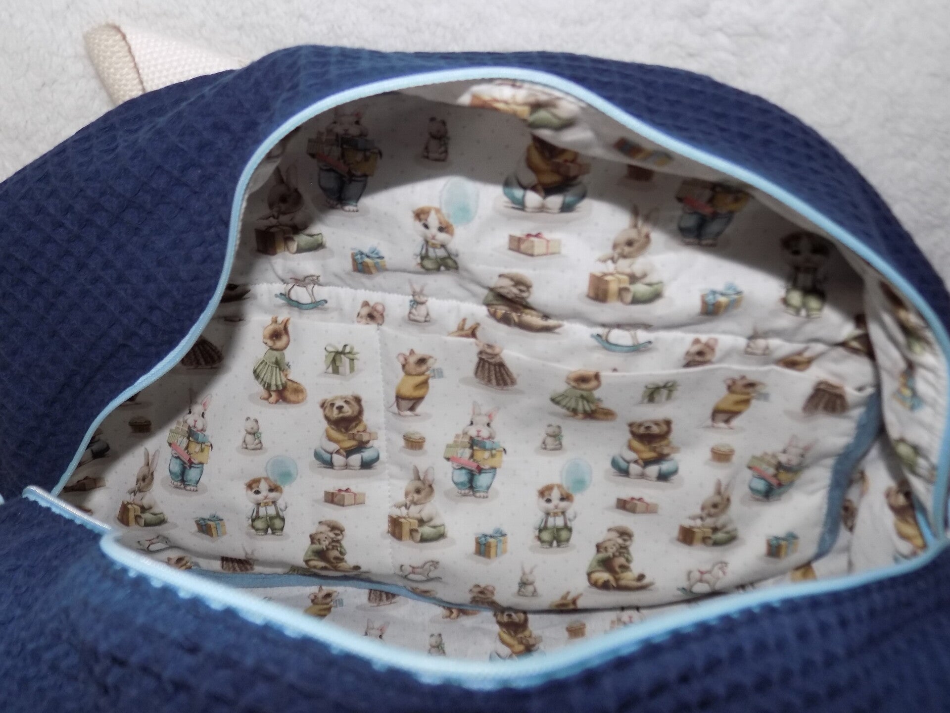 Sac à langer de grande taille en tissu à motif 100% coton certifié okéo-tex et tissu gauffré de couleur bleu jean