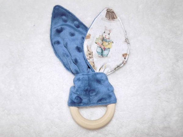 Hochet anneau en bois naturel, oreilles tissu 100% coton certifié okeo-tex et tissu minky de couleur bleu jean