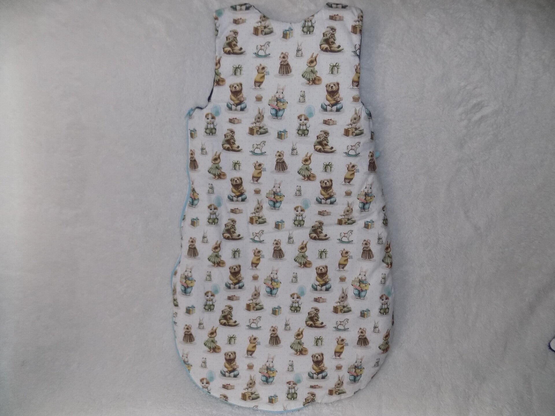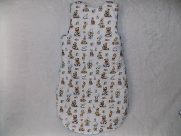 Gigoteuse de 0 à 6 mois en tissu minky de couleur bleu jean en haut à l'avant et tissu 100% coton certifié okéo-tex à l'avant et à l'arrière, intérieur en tissu minky de couleur bleu jean