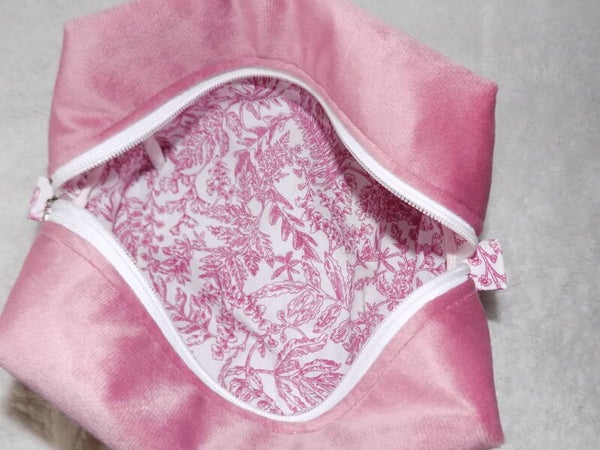 Petite trousse de toilette en tissu de velour de couleur rose, intérieur en coton de couleur blanc à motif rose.