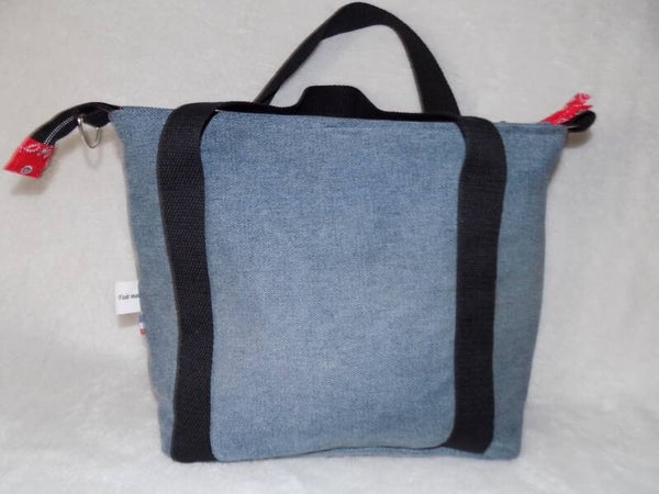 Sac vintage en jean bleu, poche avant en coton rouge à motif avec 2 poche à l'intérieur.