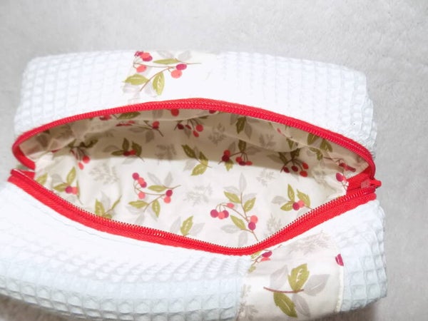 Trousse de toilette avec anse en tissu gaufré de couleur vert menthe décoré de tissu 100% coton à motif cerises.